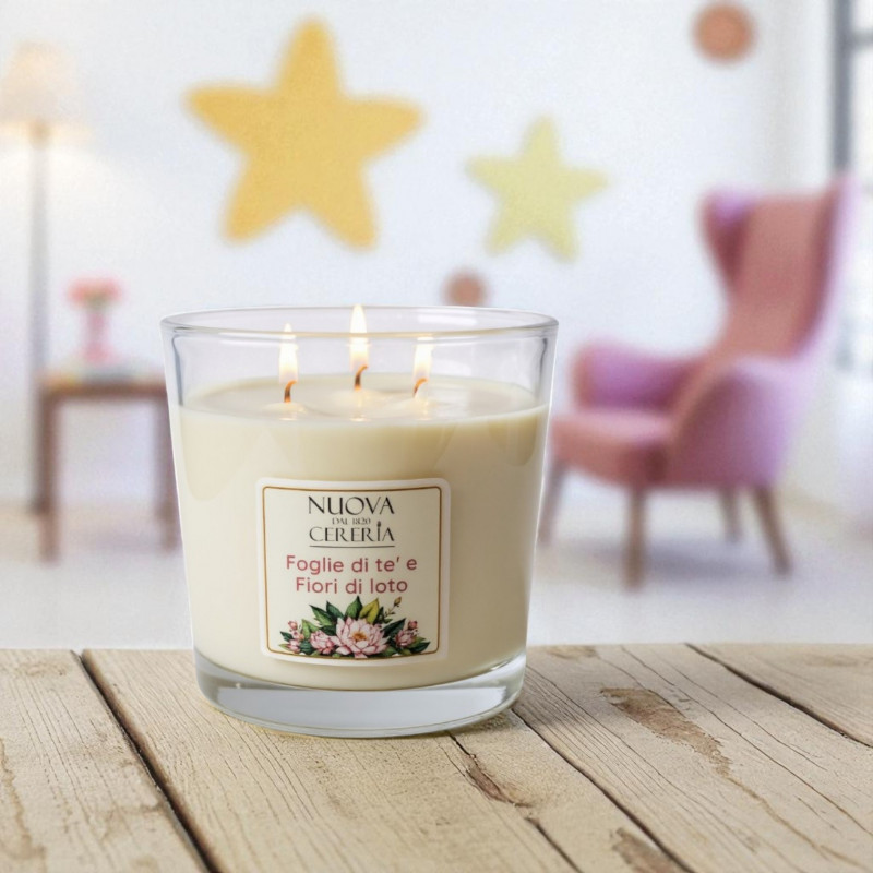 CANDELA IN VASO TRINITY FRAGRANZA FOGLIE DI TE' E FIORI DI LOTO
